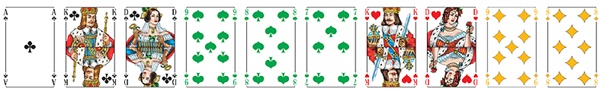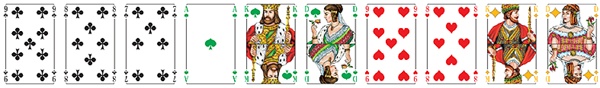 Talia do gry w skata liczy 32 karty, w 4 kolorach, każdy po 8 kart. Kolory według wartości to: